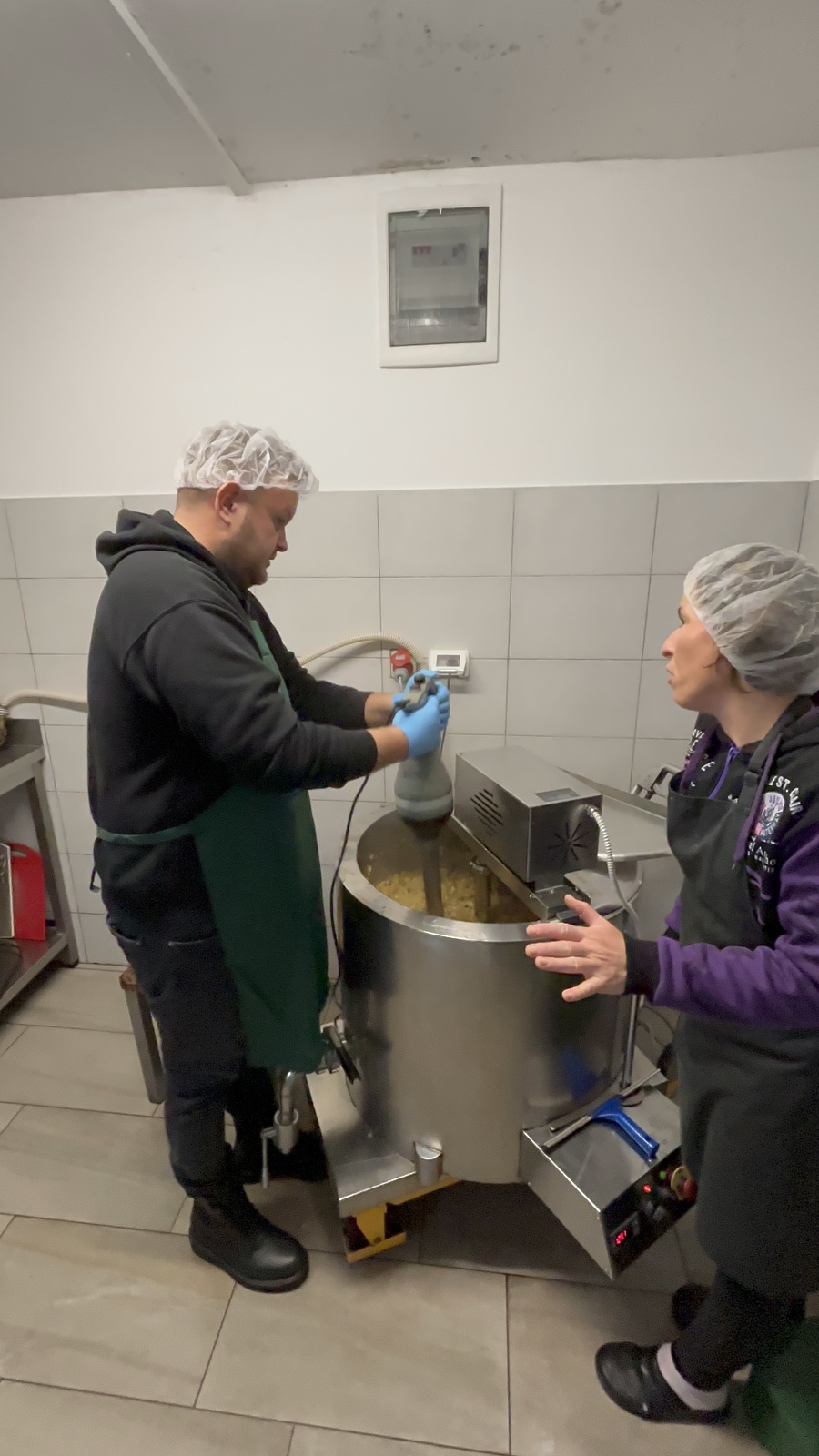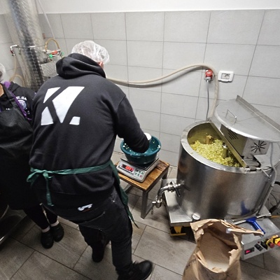 Kuhanje marmelade: pripravi jabolk, orehov in rozin ter še preostalih sestavin (vseh vam seveda ne bomo izdali 😉) je sledilo kuhanje v kotlu pri 130 stopinjah Celzija.