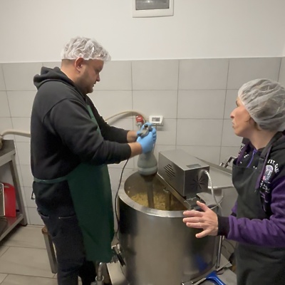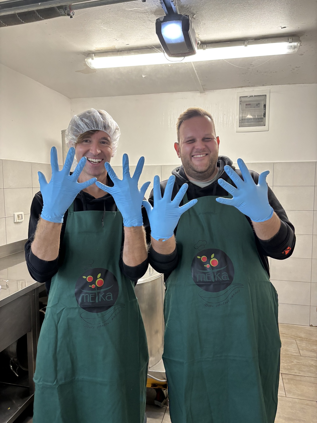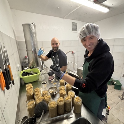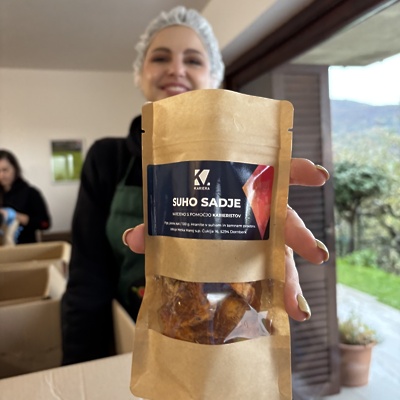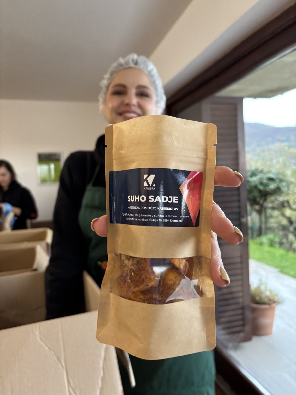Zjutraj smo se zbrali, se udobno namestili v kombi in se polni pričakovanj odpravili proti Primorski, k Metki Harej (Dobrote Metka), dobitnici letošnje nagrade Agrobiznis za najbolj inovativen izdelek. Pričakala nas je na čudoviti lokaciji, s pogledom na Trstelj in v daljavi celo na zasnežene italijanske Dolomite, ki jih je objemalo prijetno jesensko sonce. Že na začetku sta nas Metka in Barbara razveselili s toplim sprejemom, ki nam je dal dodatno energijo za ustvarjanje.