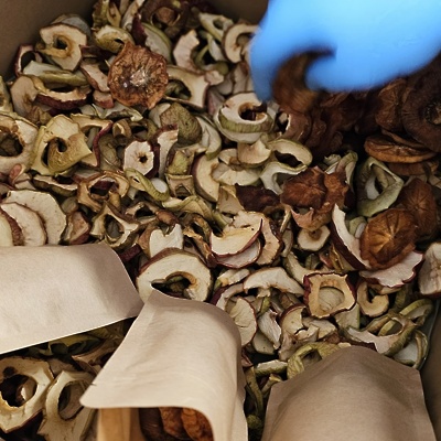 Polnjenje in pakiranje: skrbno smo polnili suho sadje v embalažo in marmelado v kozarce.